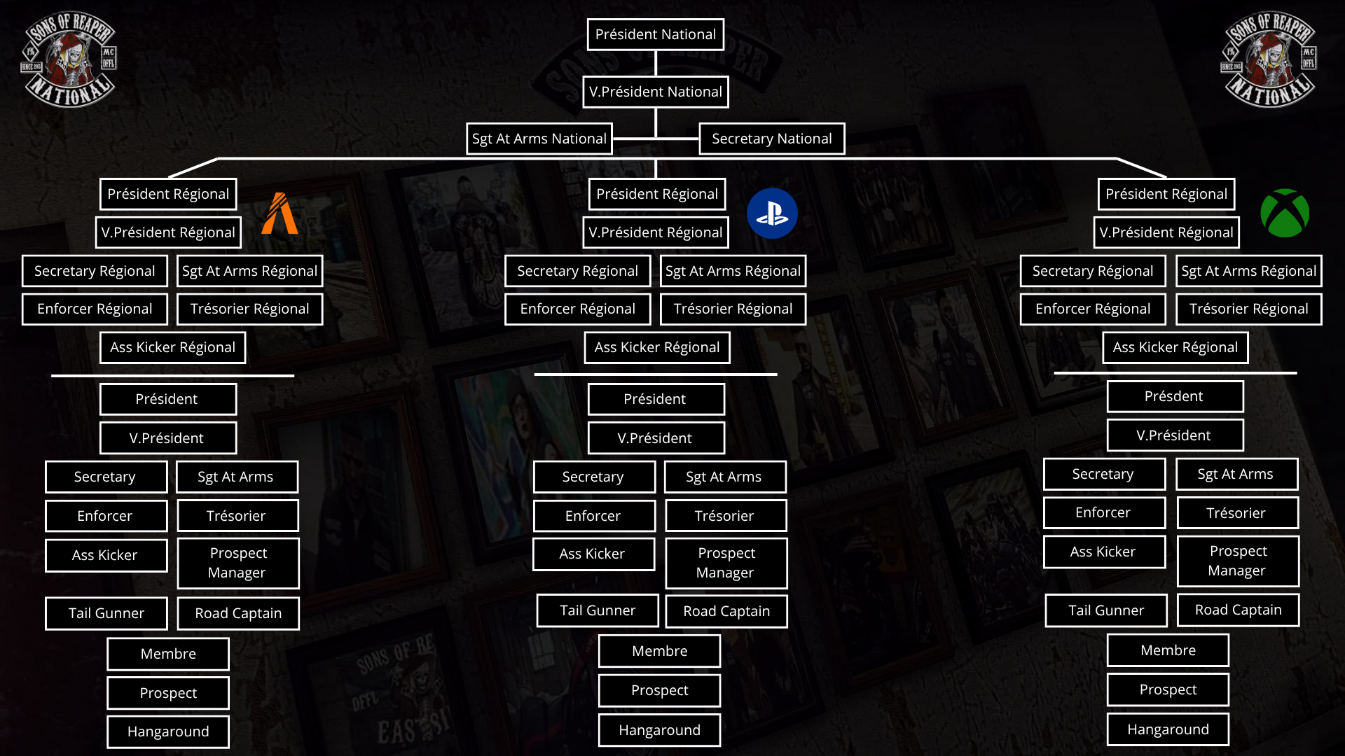 Le Président régional d' un État à pour mission de superviser tous les chapters implantés dans son État, il doit être sûr s' assurer de la bonne représentation du club dans son État ainsi que le respect de la charte de la Nation SOR, il Remonte les informations aux rang Nationaux.